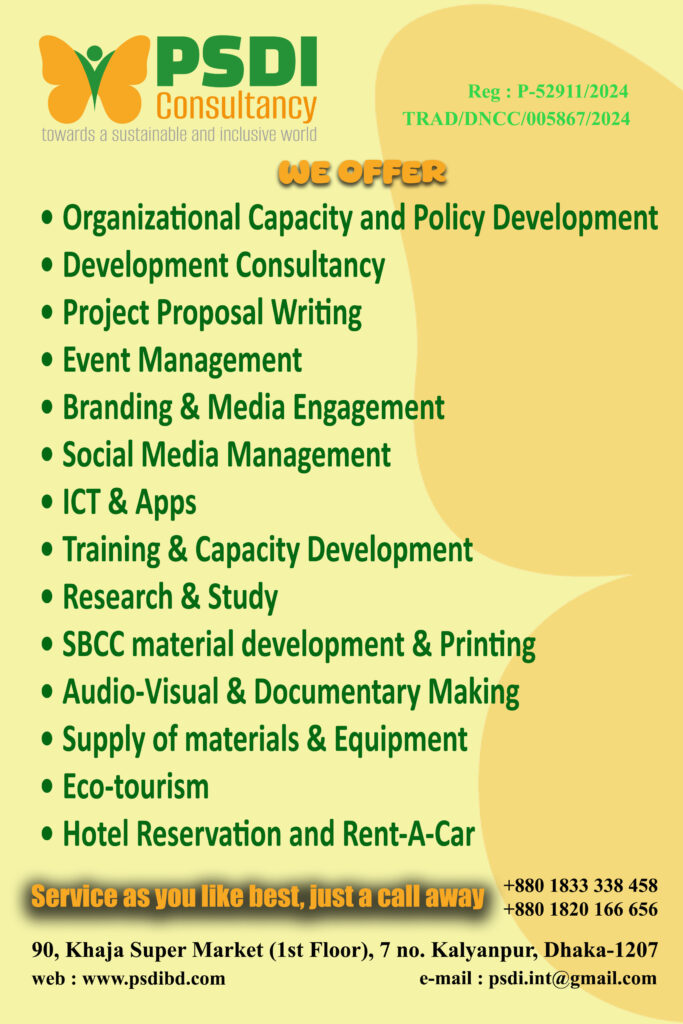 PSDI Consultancy, a profit-oriented development and business entity, operates with a team of experts and consultants who work together to identify objectives, focus areas, problems, or root causes. They address challenges or obstacles using a blend of innovative and traditional strategies, gather and assess feedback and outcomes, and progress towards making an impact. Established on April 7, 2024, the founders of PSDI Consultancy bring over two decades of experience from both public and private sectors, utilizing their expertise to enhance the future for individuals and organizations. The acronym PSDI represents 'Partnership for Sustainability, Dignity, and Inclusion', reflecting the consultancy's commitment to creating a sustainable world where people can live with dignity, while also incorporating nature and wildlife into the development process.