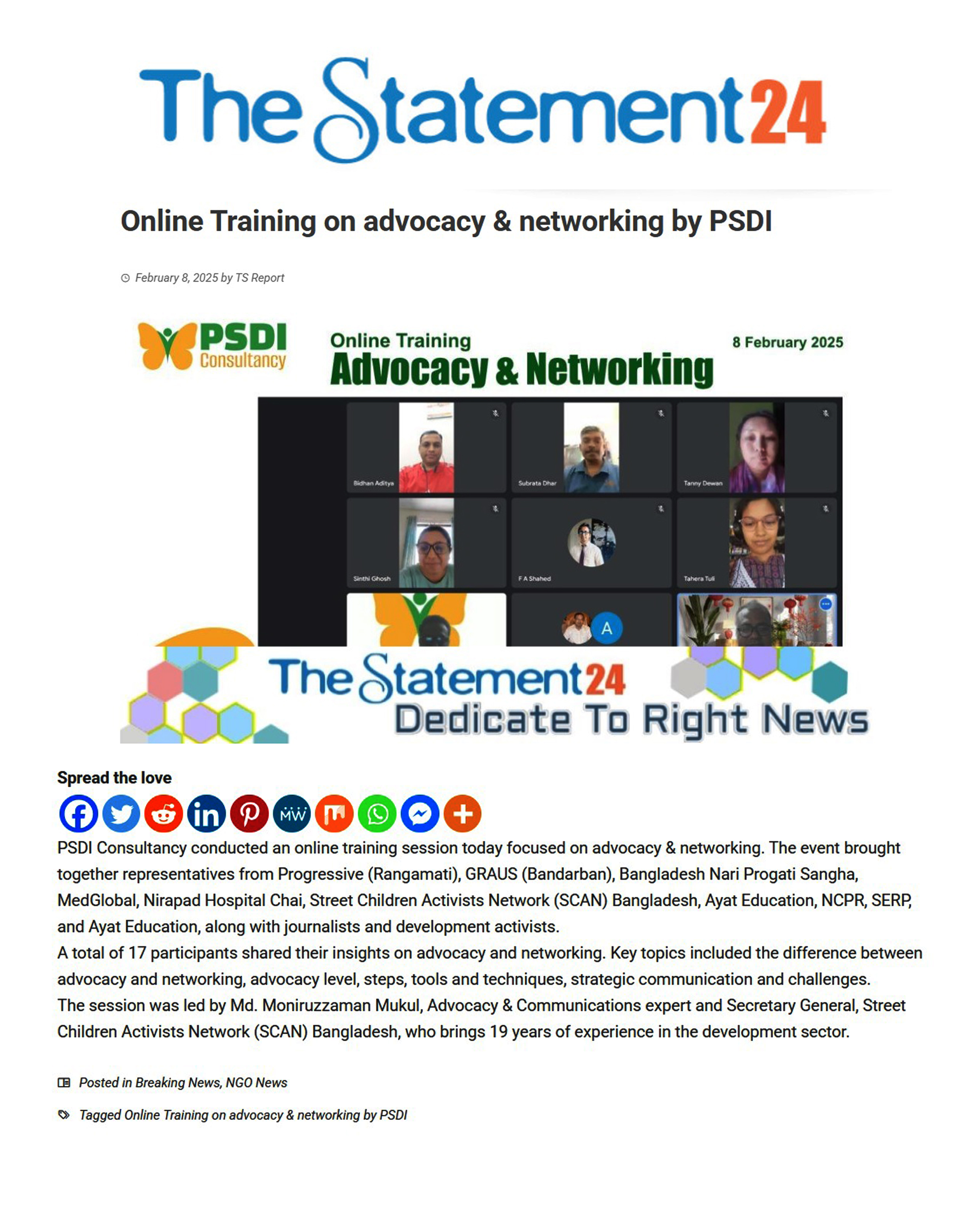 PSDI Consultancy conducted an online training session focused on advocacy & networking. The event brought together representatives from Progressive (Rangamati), GRAUS (Bandarban), Bangladesh Nari Progati Sangha, MedGlobal, Nirapad Hospital Chai, Street Children Activists Network (SCAN) Bangladesh, Ayat Education, NCPR, SERP, and Ayat Education, along with journalists and development activists.